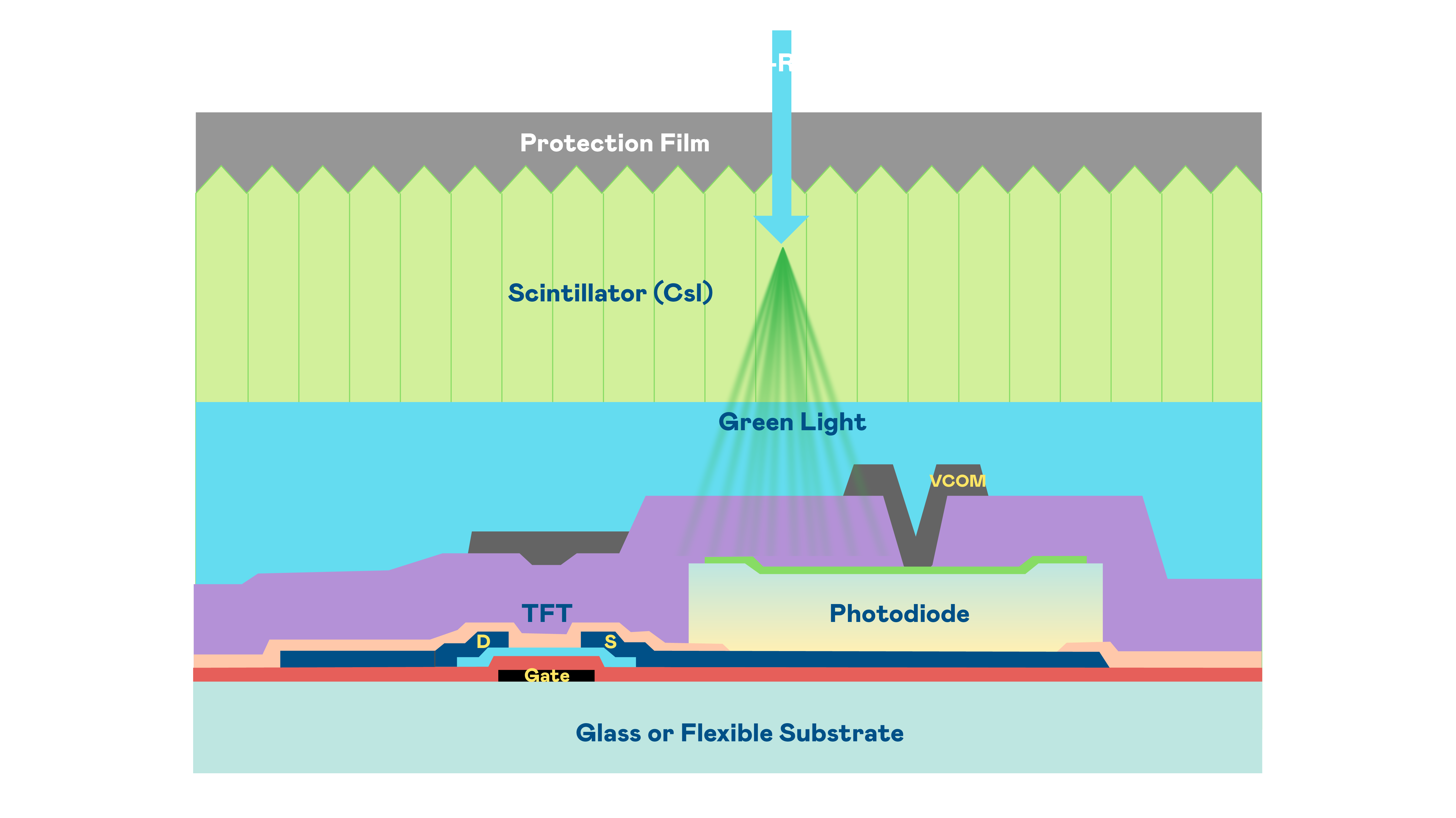 Ebpay的X光影像感測陣列使用薄膜電晶體 (TFT) 作為每個像素的讀取開關,搭配光電二極體(Photodiode)的光電轉換元件,用以感測X光影像訊號。